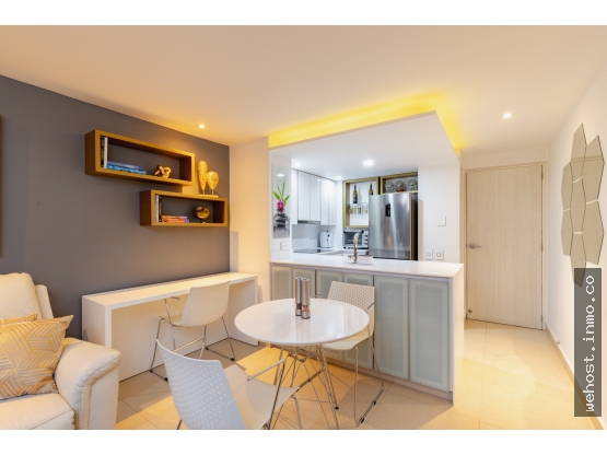 Fully furnished 48m² elegant and recently renovated apartment in El Poblado. It features a cozy living room, an open kitchen equipped with appliances, a two-seater dining table, and a workspace. There are two bedrooms with built-in closets and windows with view to the outside of the building. A full bathroom is located in the hallway between the two bedrooms. Each bedroom and the living room have televisions.